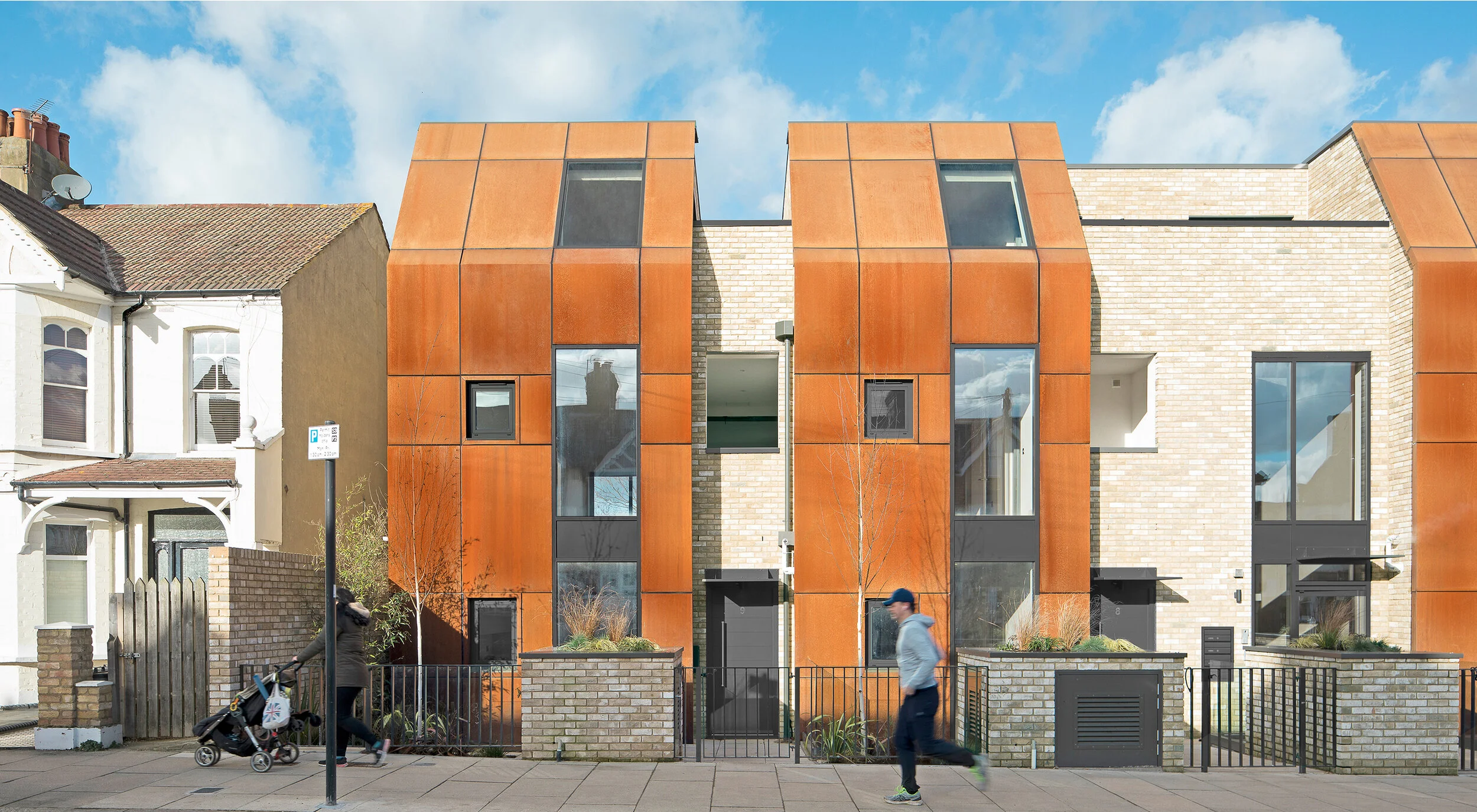 Comprising two and three-bedroom family homes, the three-storey building is a contemporary interpretation of the London townhouse and an example of how sensitive infill development can increase housing densities in the city suburbs while remaining within the context of the local scale and character.