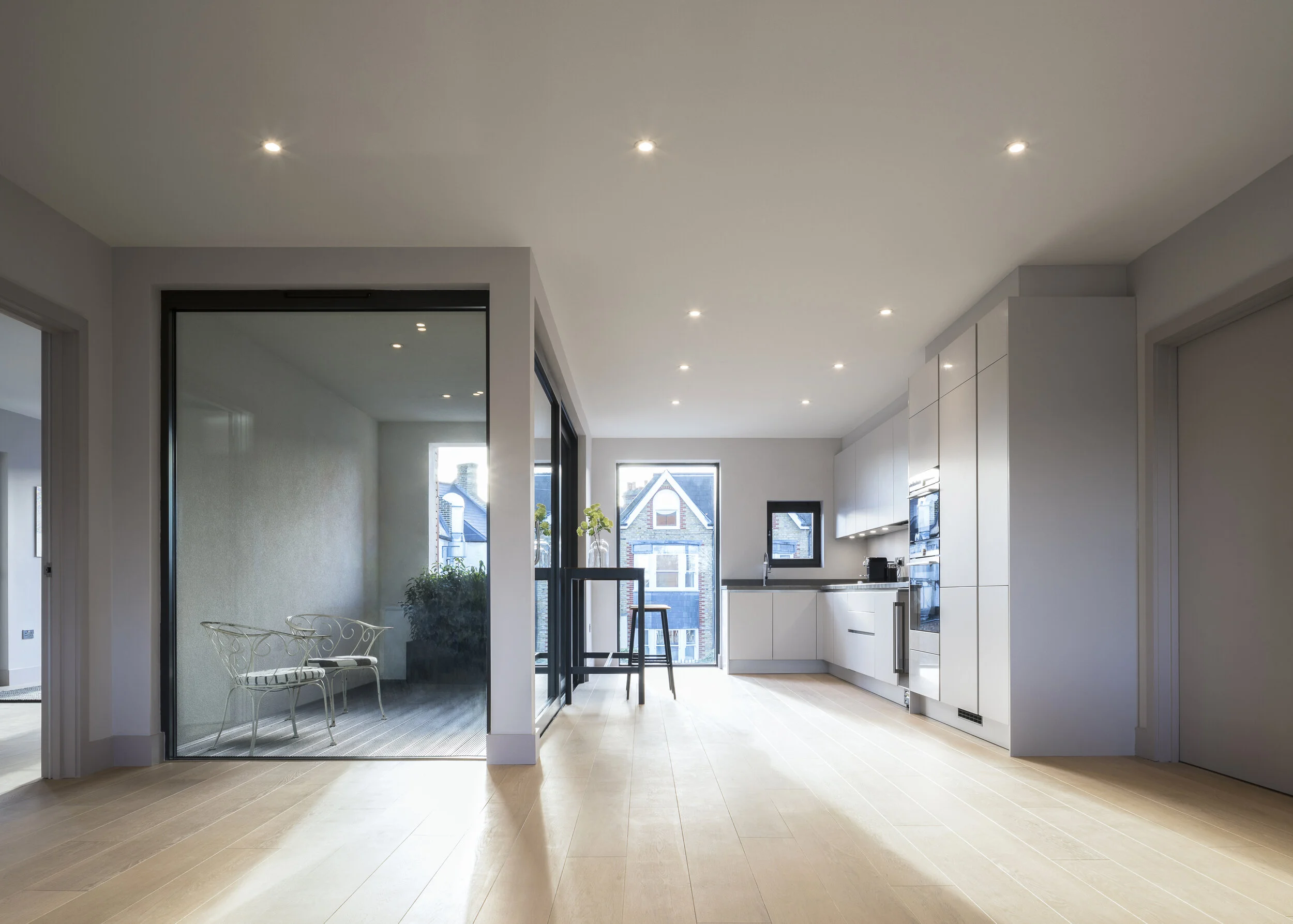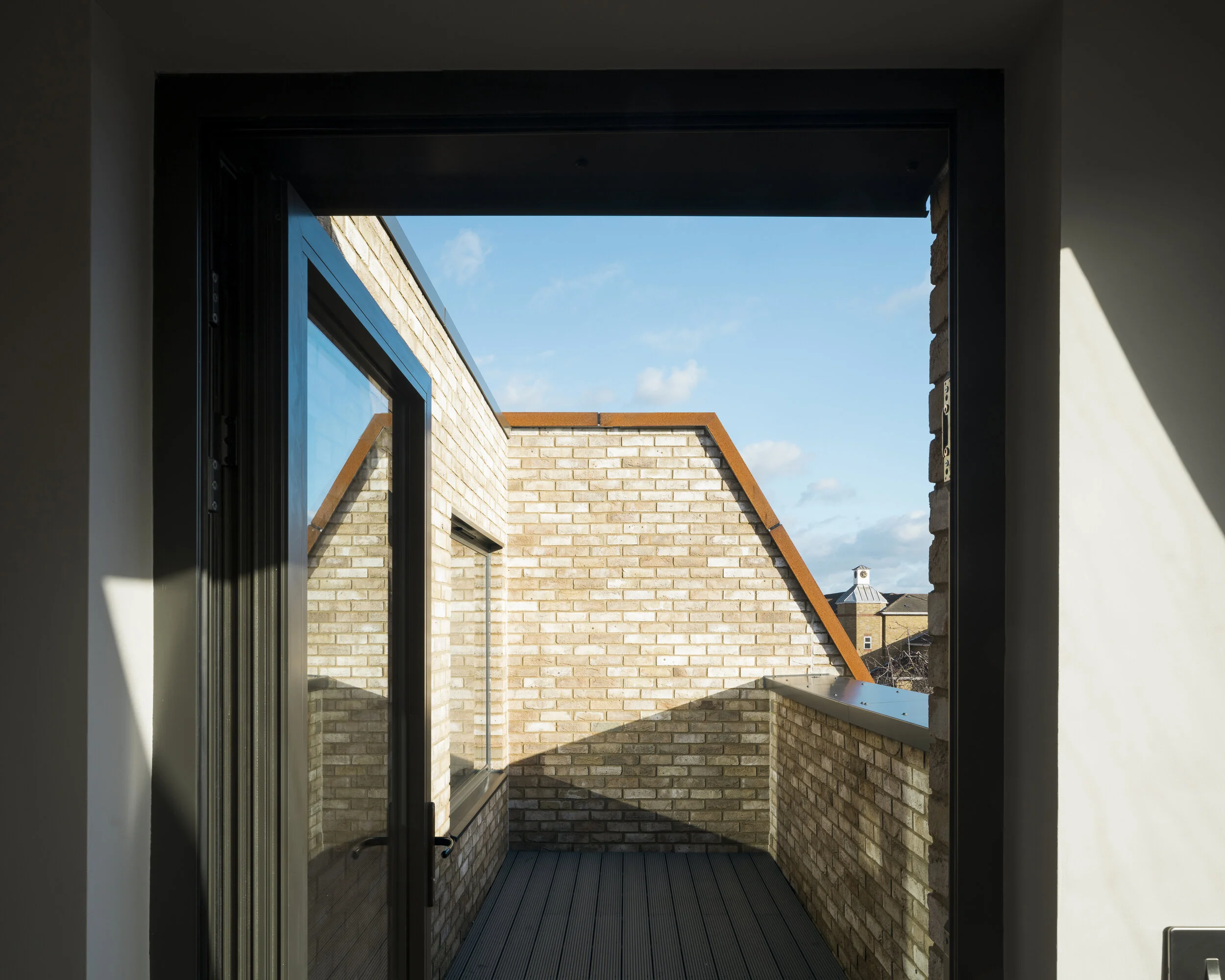Five duplex units are accessed from individual entrances at ground level. Density was achieved on site without compromising personal space by placing bedrooms at lower ground floor level, with living quarters above. At the crown of the building, four single-storey flats with balcony terraces share a communal circulation atrium. Recessed and clad in London stock brick, these act as visual dividers to break up the linear façade.